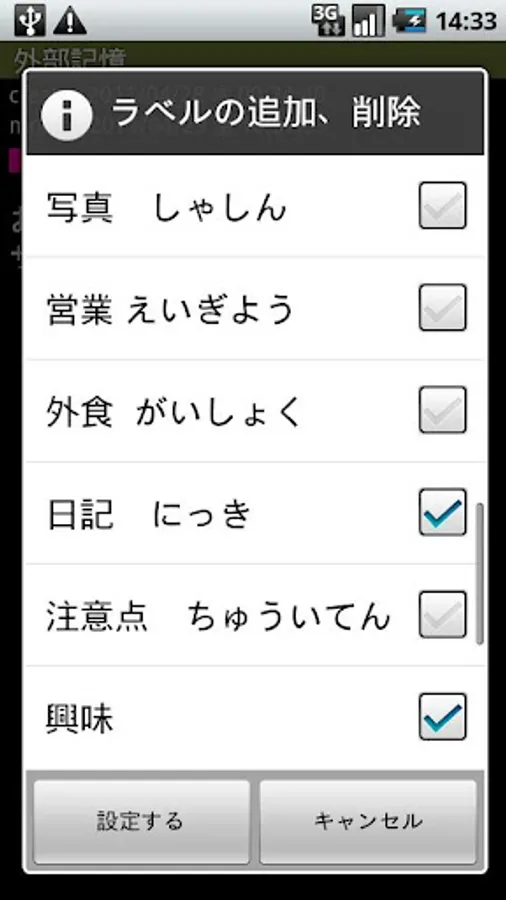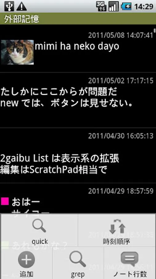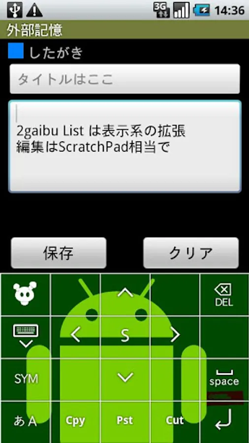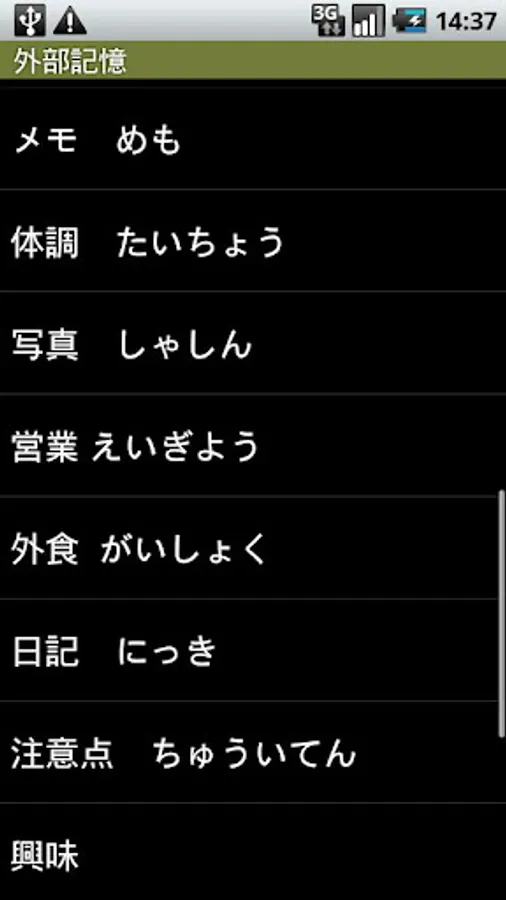 Your data can be transmitted to other applications by long click/menu-share, and can be converted into SDcard:/gaibu/kioku.xml.