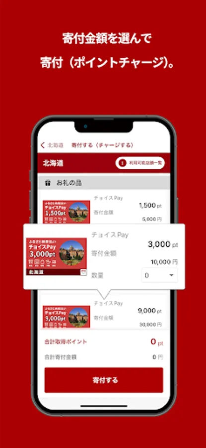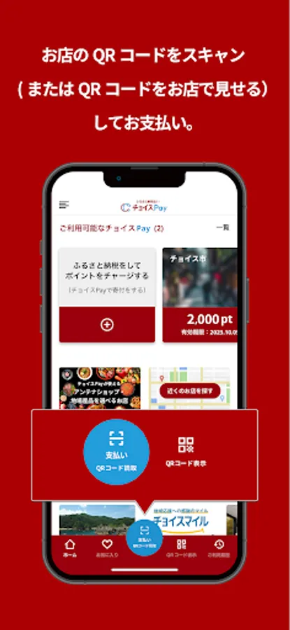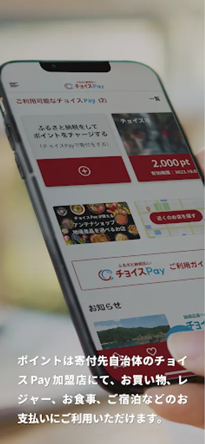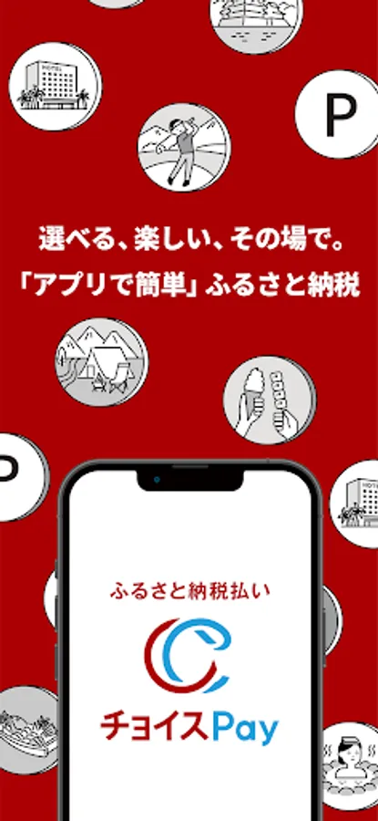 Choice Pay is an app that allows you to enjoy traveling and shopping with the points you receive as a thank-you gift for hometown tax payment, operated by "Furusato Choice", a hometown tax payment site with the highest number of thank-you gifts/local governments in Japan.