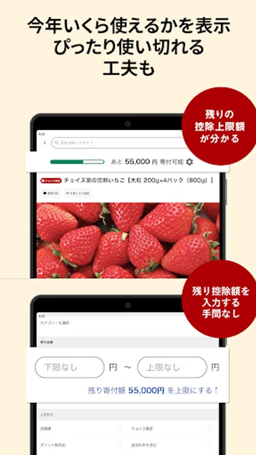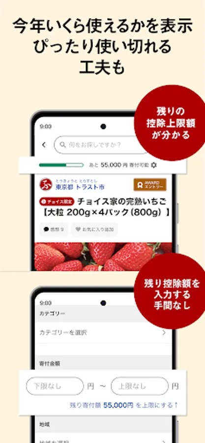 Display the maximum amount of deduction that can be used this year. Furthermore, if you use the "narrow down" function, you can search for thank-you items without having to enter the remaining donation amount.