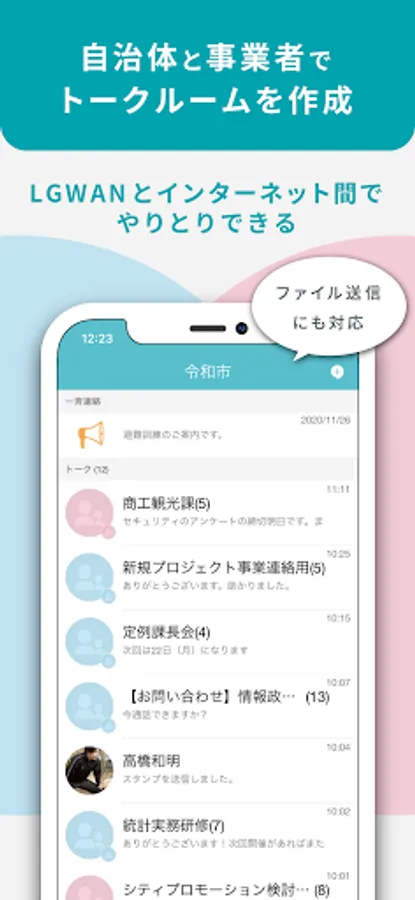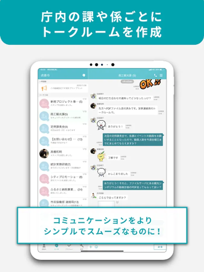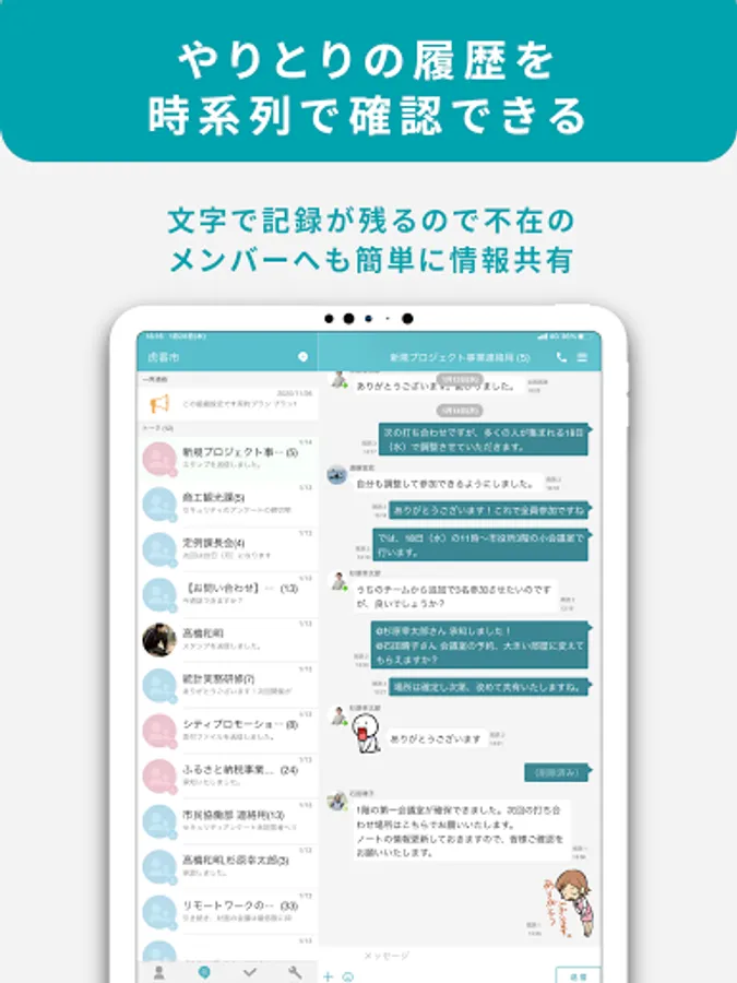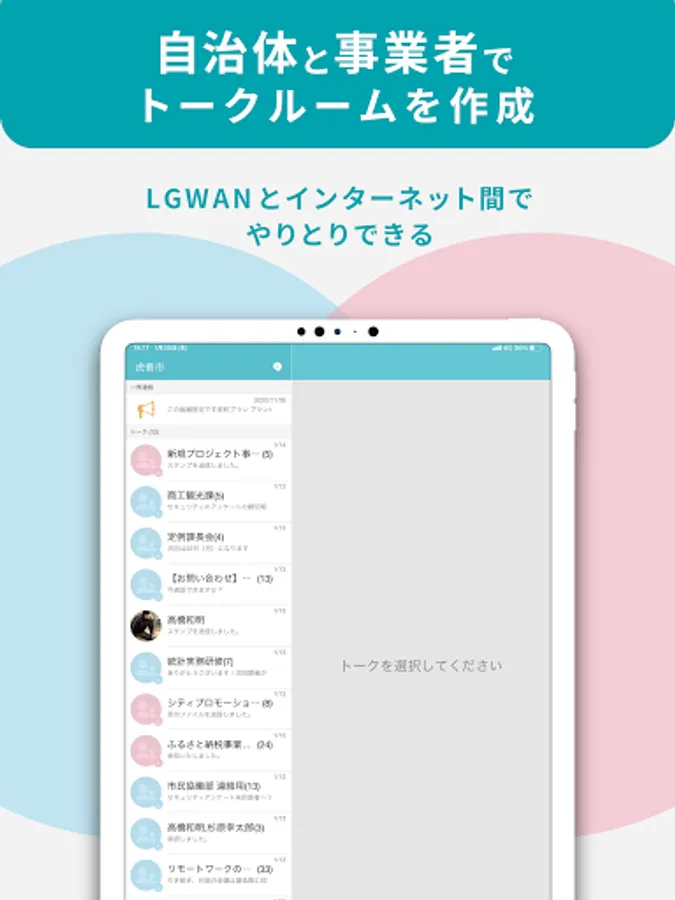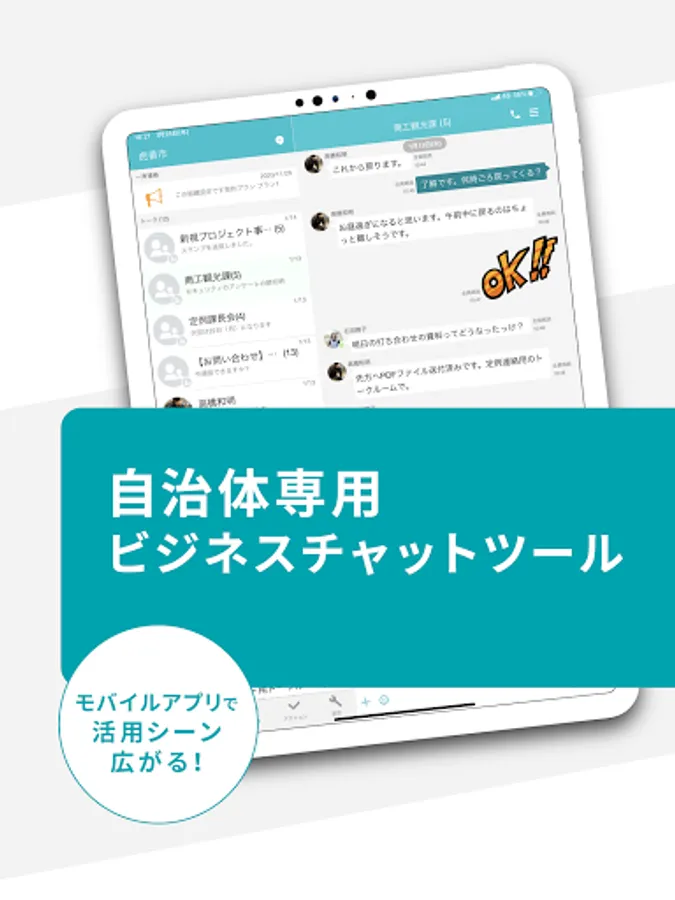 LoGo Chat is a local government-only business chat that can be used in a highly secure LGWAN environment and connects within a local government, between multiple local governments, branch offices, and external businesses in real time.