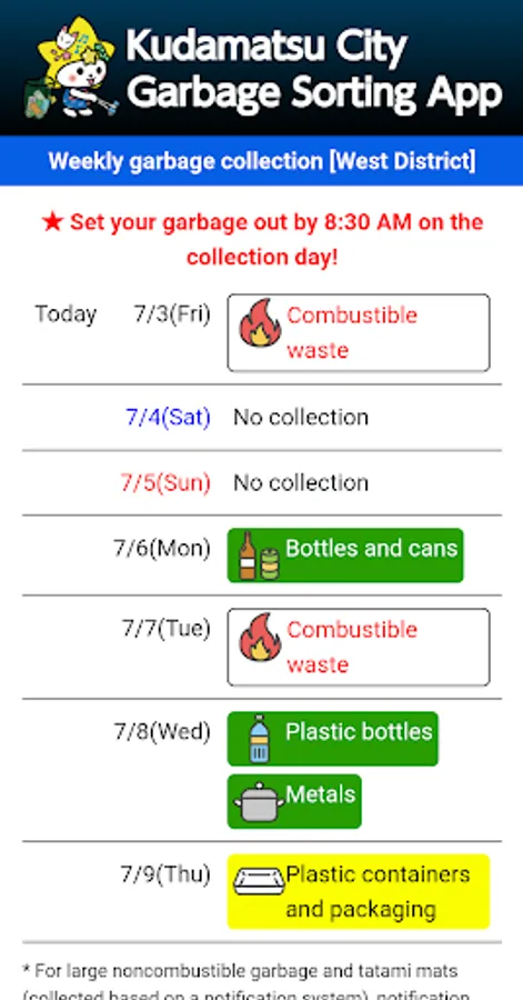 A convenient and helpful app that explains how to sort and set out garbage in Kudamatsu City.