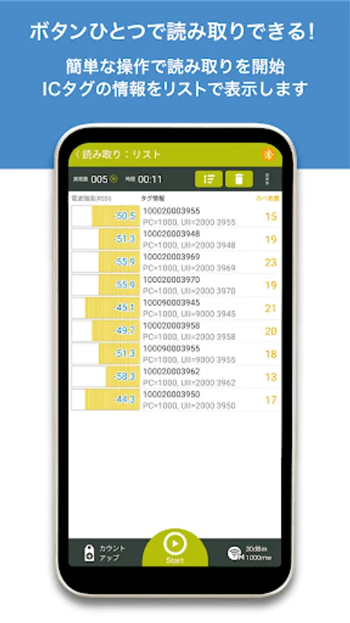 ◎ You can check the number of cards read, elapsed time, IC tag information, received signal strength, etc. in a list.