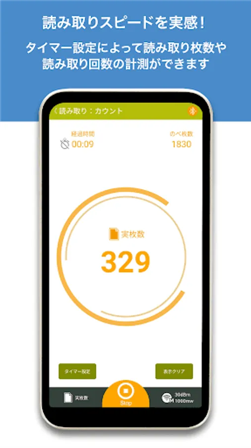 ◎When you execute tag reading, the number of read IC tags is counted. By setting the timer, you can measure the reading speed of IC tags and the number of readings. You can also switch the display between "Actual number" and "Total number" by changing the "Display mode" at the bottom left.