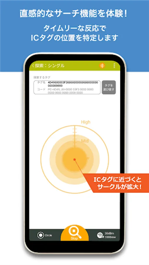 It has functions for reading, writing, and searching IC tags, as well as basic settings such as the radio field strength and buzzer volume of the paired RFID reader. The design allows intuitive operation, so even first-time users can easily use it by adjusting the signal strength to change the reading distance and finding hidden IC tags with the search function.