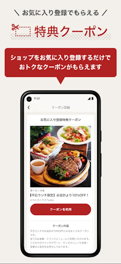 You can get coupons distributed only in the app and exclusive coupons for shops added to your favorites. The acquired coupons are saved in the "Coupon BOX", so please present them at the store where they were issued.