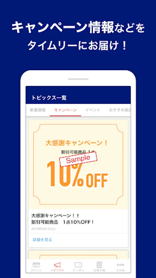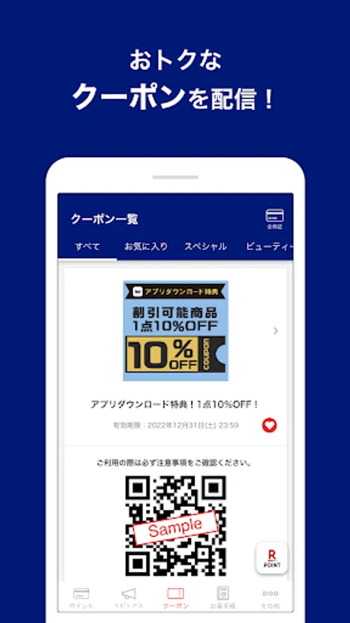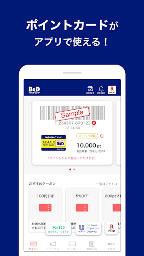 You can use it to display point cards, make smartphone payments, acquire coupons, check advantageous information such as event information and campaign information, store search, and link with the medicine notebook app.