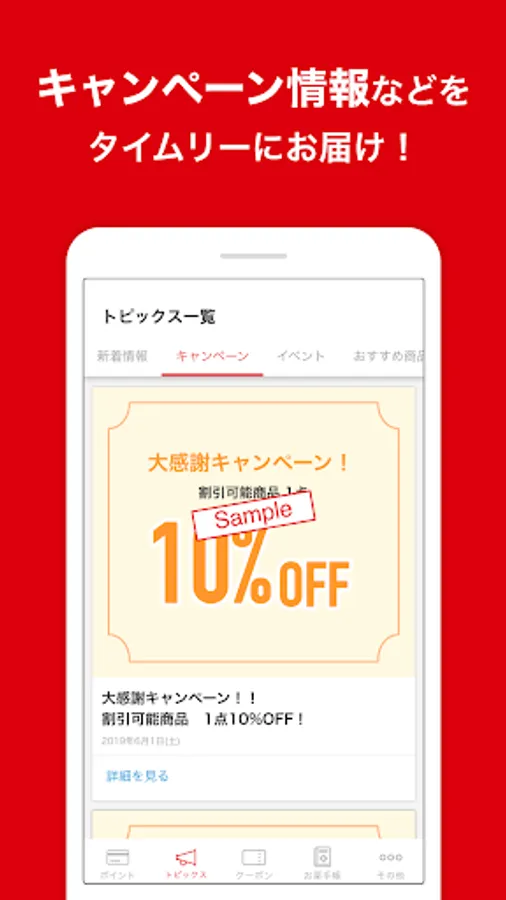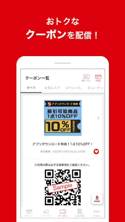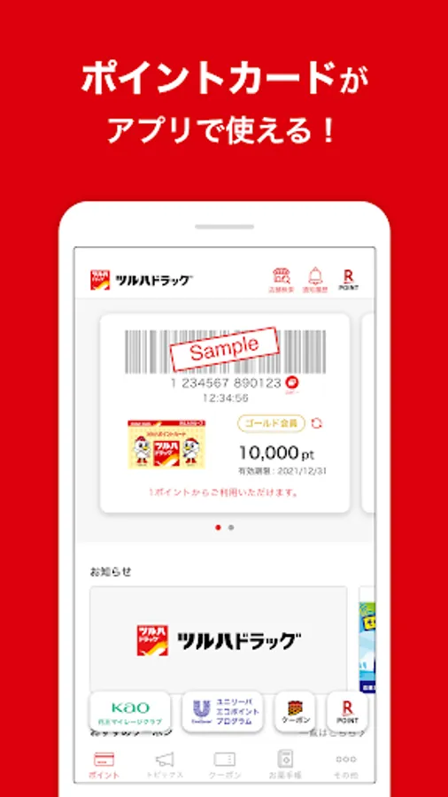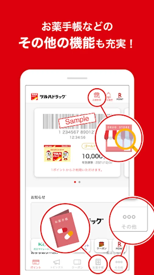 You can use it to display point cards, make smartphone payments, acquire coupons, check advantageous information such as event information and campaign information, store search, and link with the medicine notebook app.