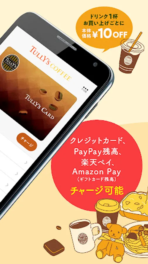 You can register as many Tully's cards as you have in the app, and payment and charging can be done smoothly without cards. In addition to credit cards, PayPay balance, Amazon Pay (Amazon gift card balance), it is now possible to charge from Rakuten Pay. If you do not have a Tully's card, you can issue a digital Tully's card within the app. By paying with a Tully's card, you can get a 10 yen discount on each drink. (Excluding some products)