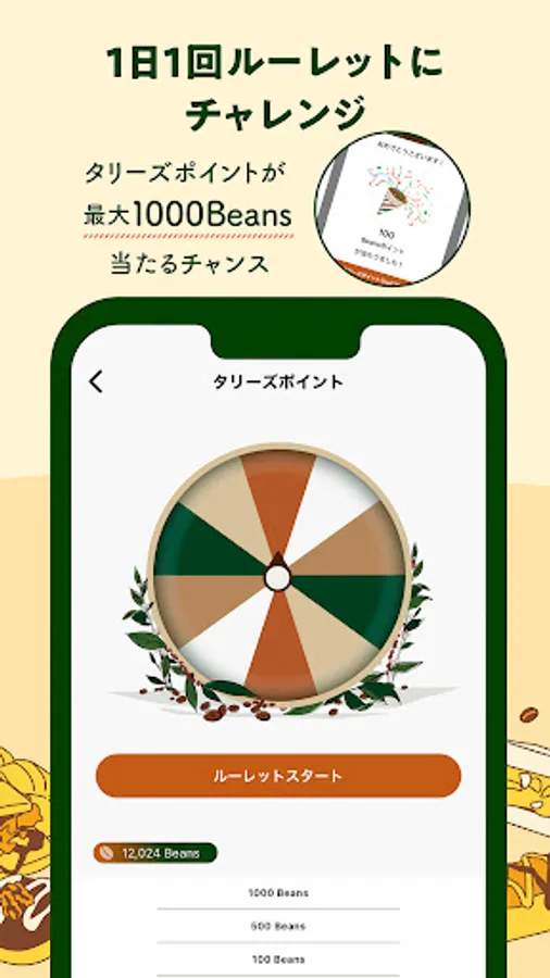 You can earn points according to the purchase amount with Tully's Card. You can also earn points with roulette that can be challenged once a day. Accumulated points can be exchanged for rewards.