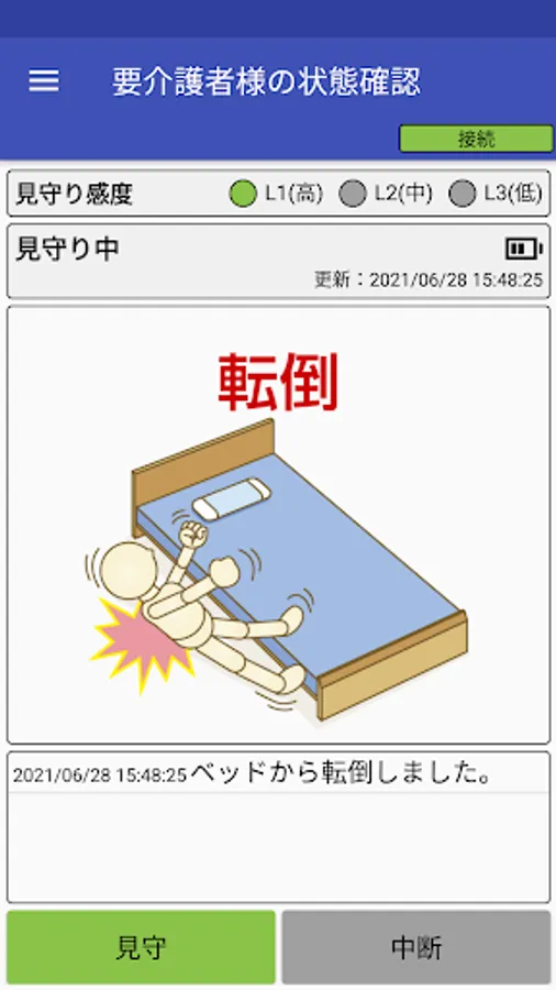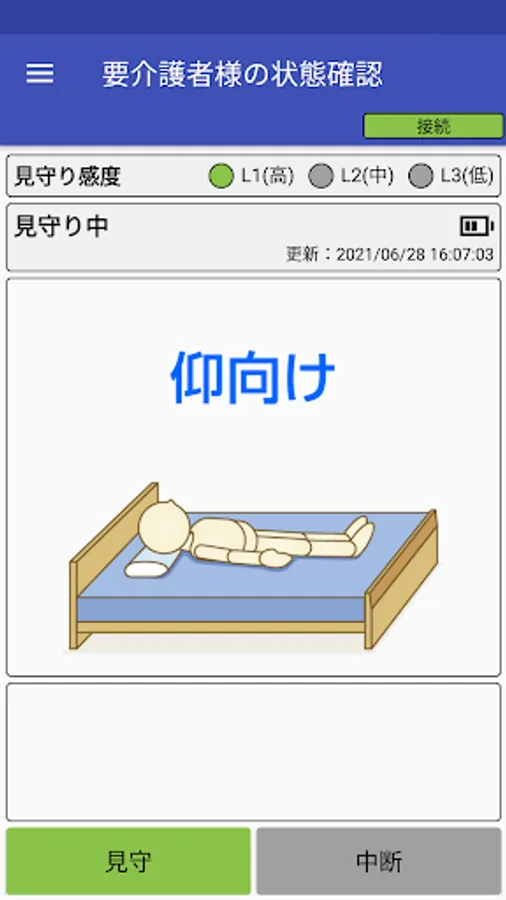 The watching system "Mamoru Ne" is a system that helps prevent accidents such as falls and reduce the watching load at night by detecting the behavior of the person requiring long-term care while sleeping and notifying the family. "Protect me" consists of a watching sensor and a receiver that the person to be watched wears. By connecting to the "Protect me" receiver via Bluetooth, this application can perform the start / end operation of watching, the watching setting, and the reception of notifications.