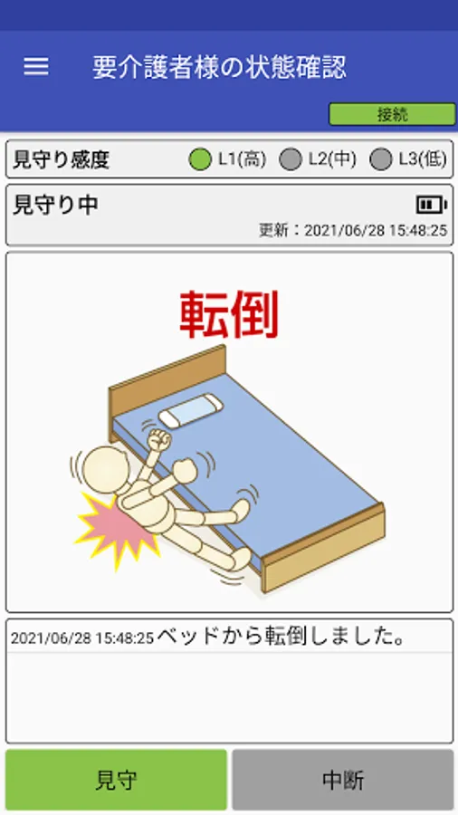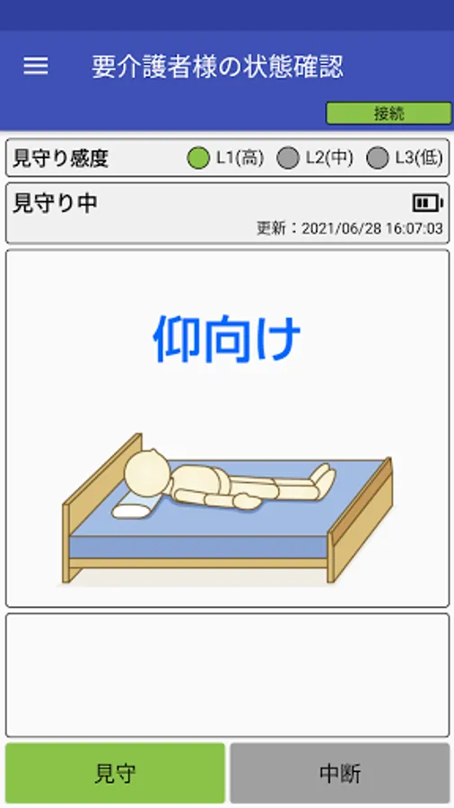 The watching system "Mamoru Ne" is a system that contributes to the prevention of accidents such as falls and the reduction of the watching load at night by detecting the behavior of the care recipient who is sleeping before getting out of bed and notifying the family. "Protect me" consists of a watching sensor and a receiver that the person to be watched wears. By connecting to the "Protect me" receiver via Bluetooth, this application can perform the start / end operation of watching, the watching setting, and the reception of notifications.