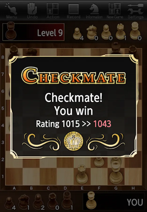 - Computer gives your level evaluation by ELO rating in rating mode,
