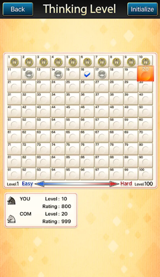 You can choose the strength of the computer from 258 to 2300 in ELO rating. Level 1 is extremely weak, and Level 100 is extremely difficult to beat!