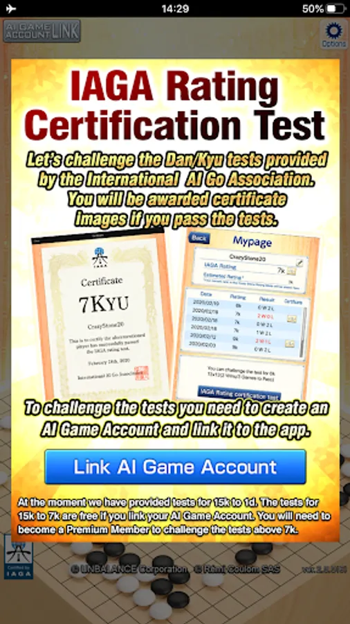 Challenge the Dan/Kyu tests provided by the International AI Go Association. You will be awarded certificate images if you pass the tests.