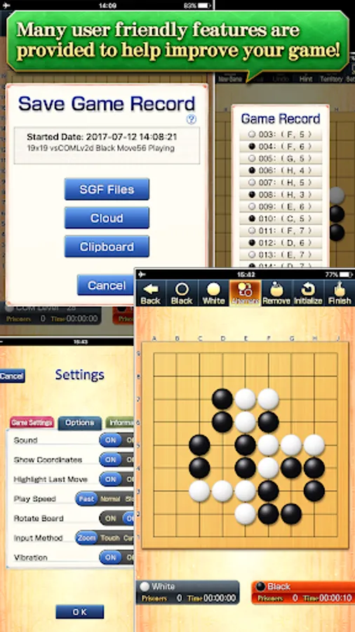 ・17 levels of play for each board size (9x9, 13x13, 19x19)