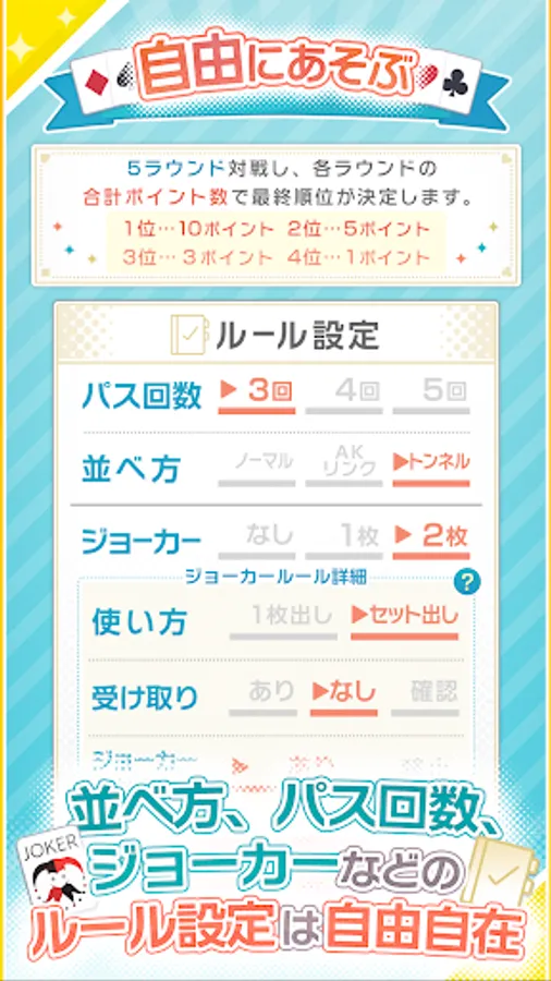 ▼ You can set rules such as how to arrange, the number of passes, and jokers as you like!