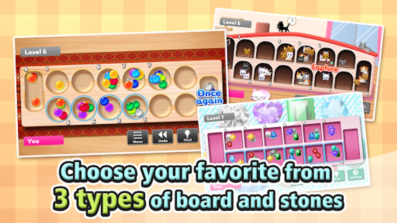 We have provided a rule description for beginners. You can learn the rules easily, so everyone can start enjoying Mancala right now!