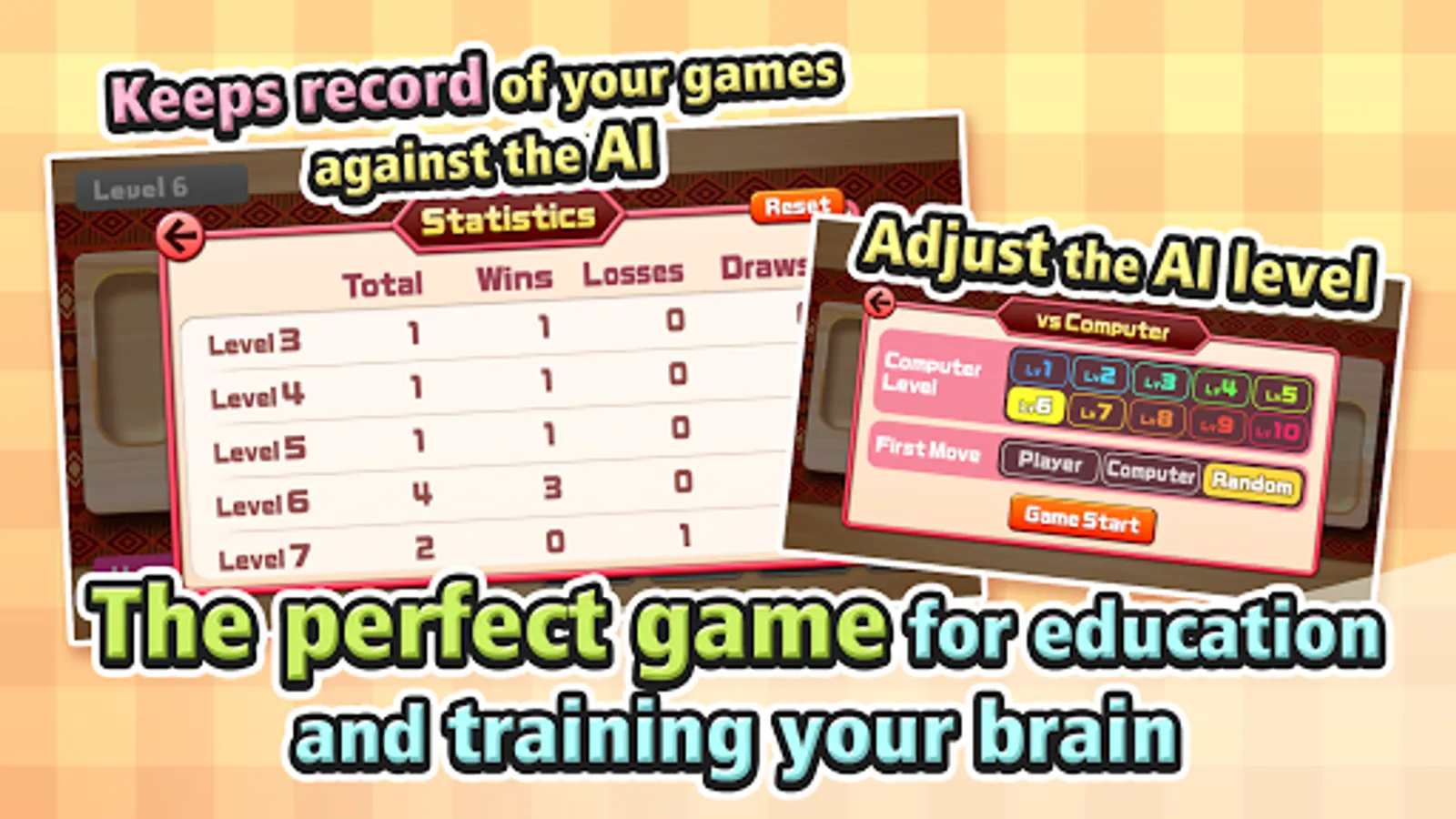 There are 10 levels for games against the computer. The lower levels are perfect to learn the game, the higher levels will be tough even for advanced players!
