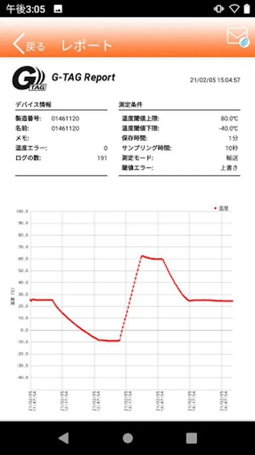 After the measurement is completed, the recorded data can be collected via BLE and sent from the smartphone as an attachment to an email. There are two types of file formats that can be attached: PDF format and CSV format.
