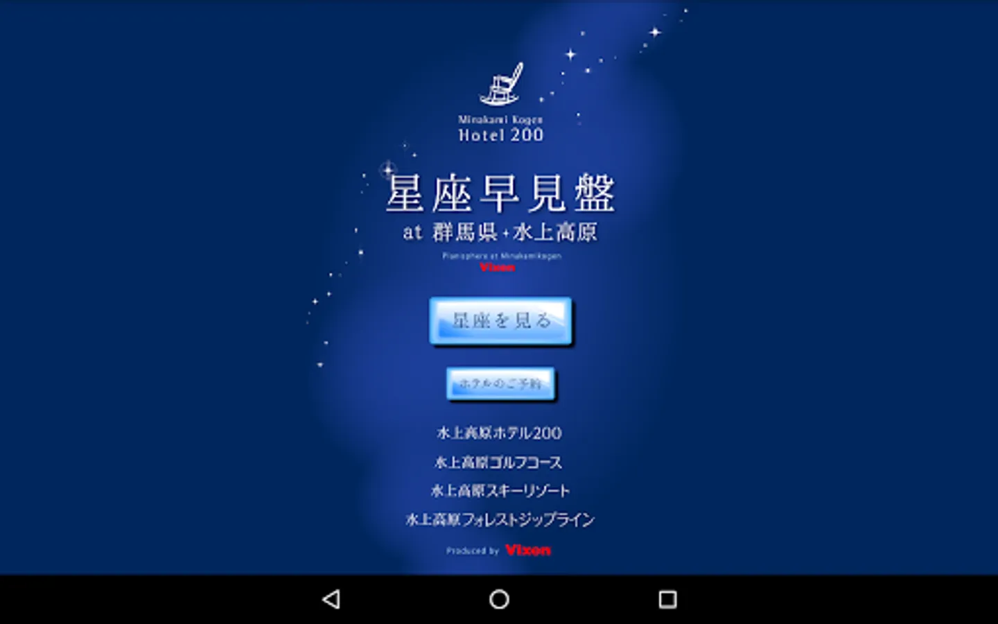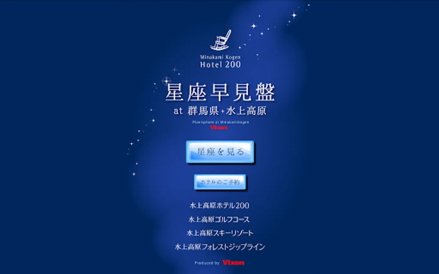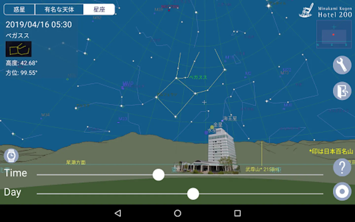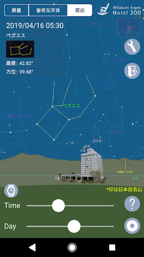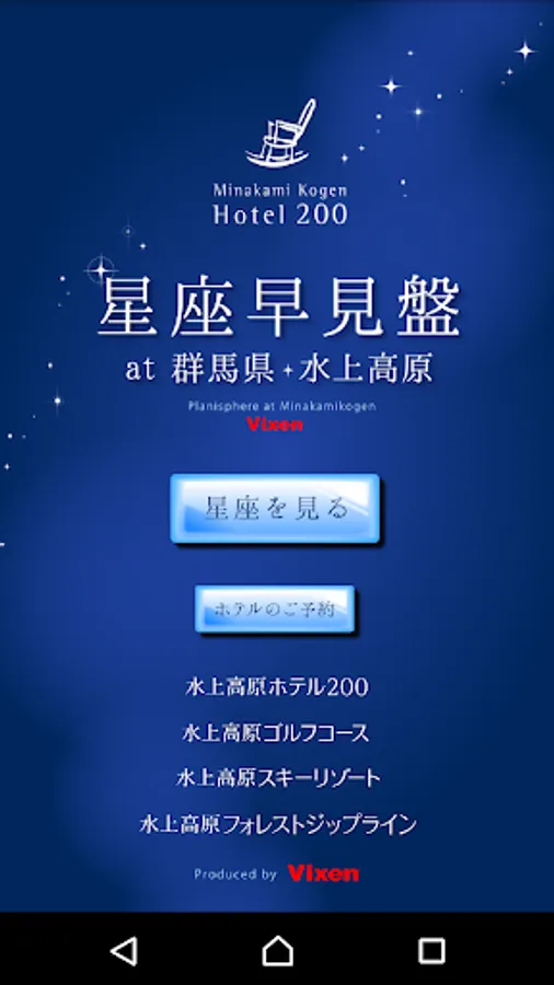 『水上高原の星空~星座早見盤~』は、群馬県みなかみ町“水上高原ホテル200”から眺められる星空と、山並みをご覧いただくことができます。標高966mの高原に位置する“水上高原ホテル200”は、空気も澄んでおり夏の快晴時には肉眼で“天の川”や流れ星を眺めることが可能です。このアプリと共に満天の星空をお楽しみください。また、関東近郊エリアであればご自宅でも星座早見盤としてご利用いただけます。
