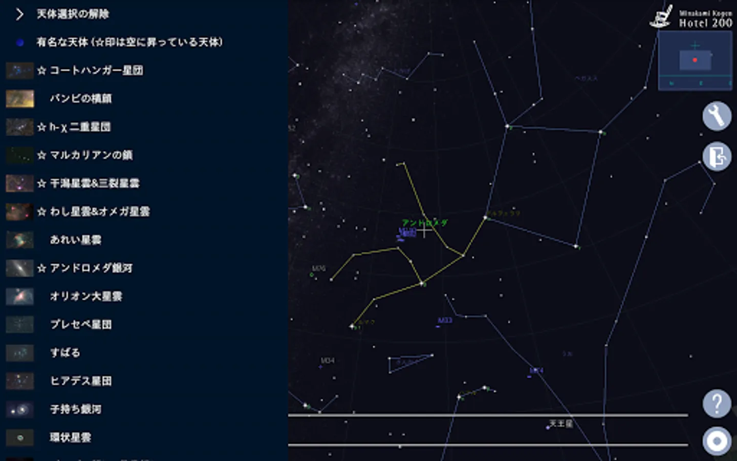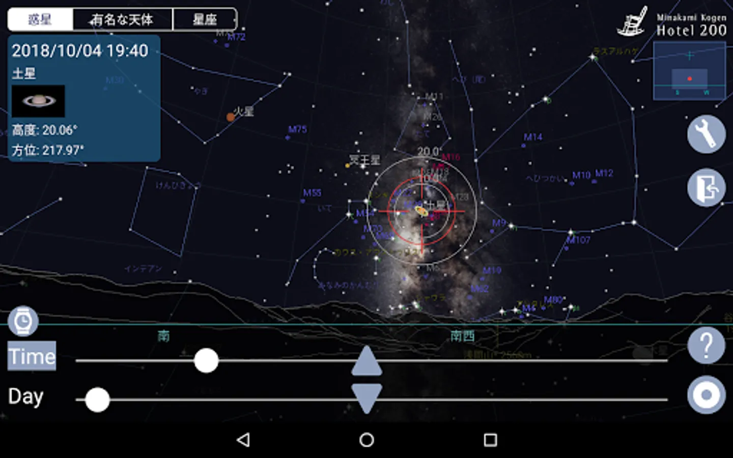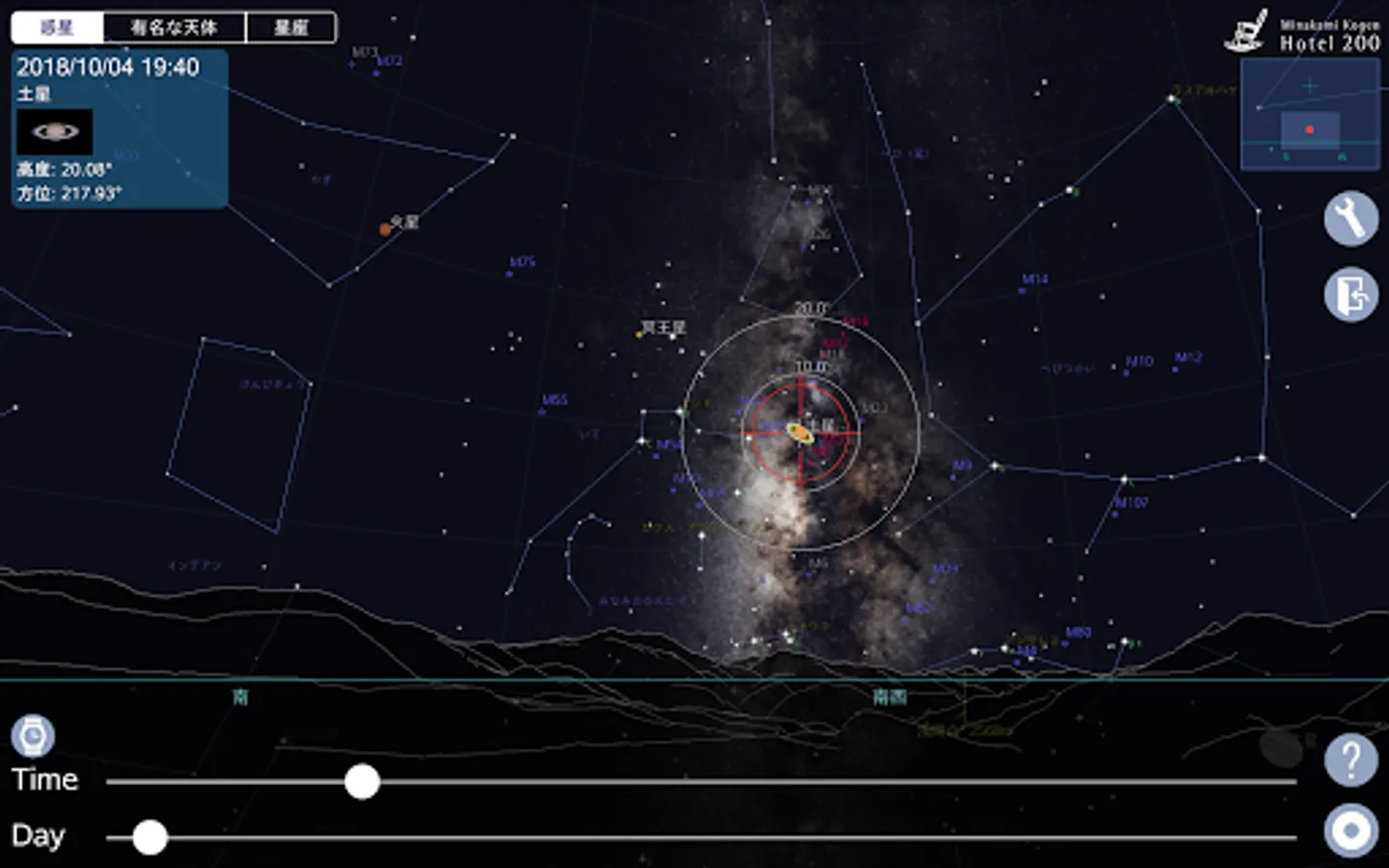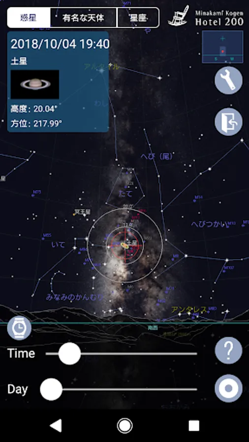 有名な天体や惑星は、日付・時間を指定することで、どの惑星がどの位置にあるのか、画面に表示される星図上で確認ができます。