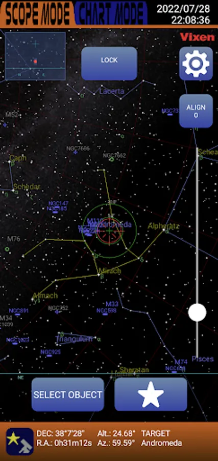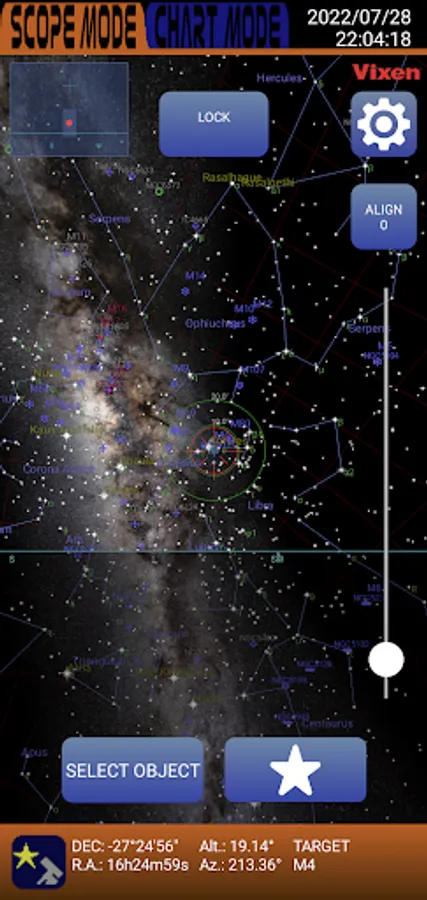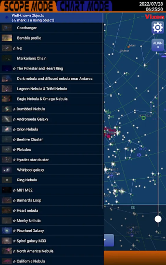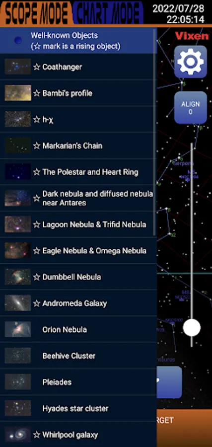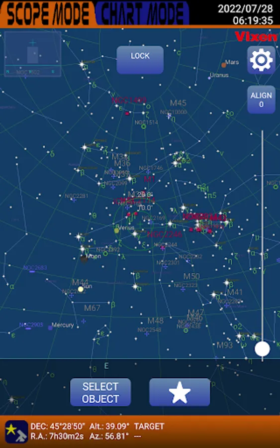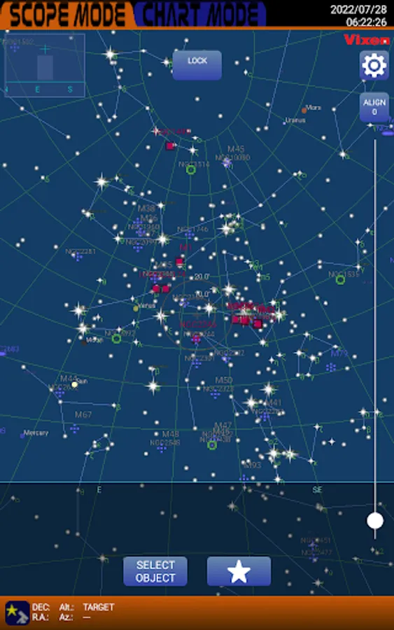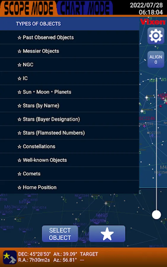 In this mode, you can select the celestial objects you want to introduce into your telescope from the star charts on the screen. You can choose a named celestial object seen inner the center green circle or bring a field of view of the telescope to the center of the star chart.
