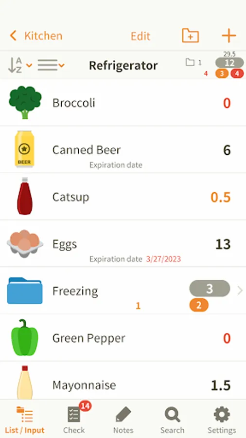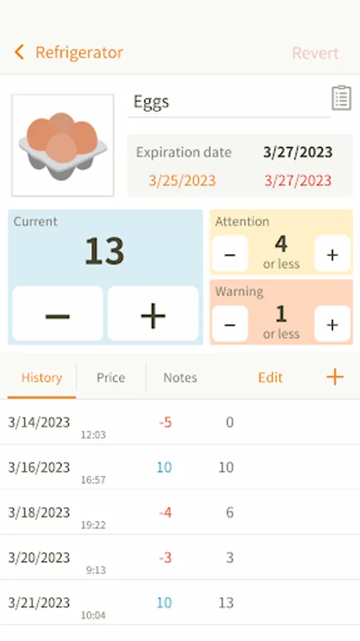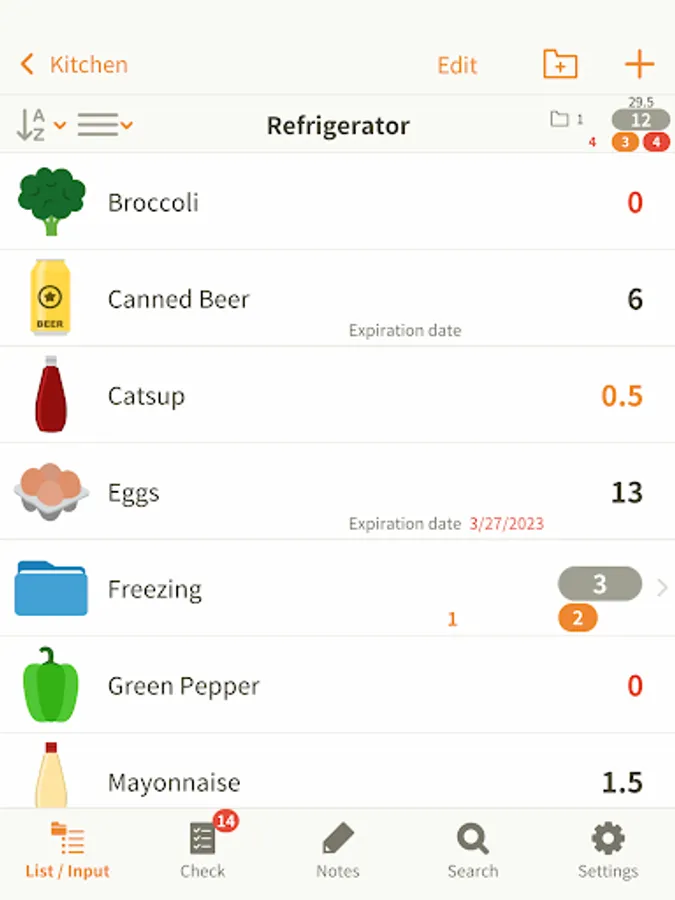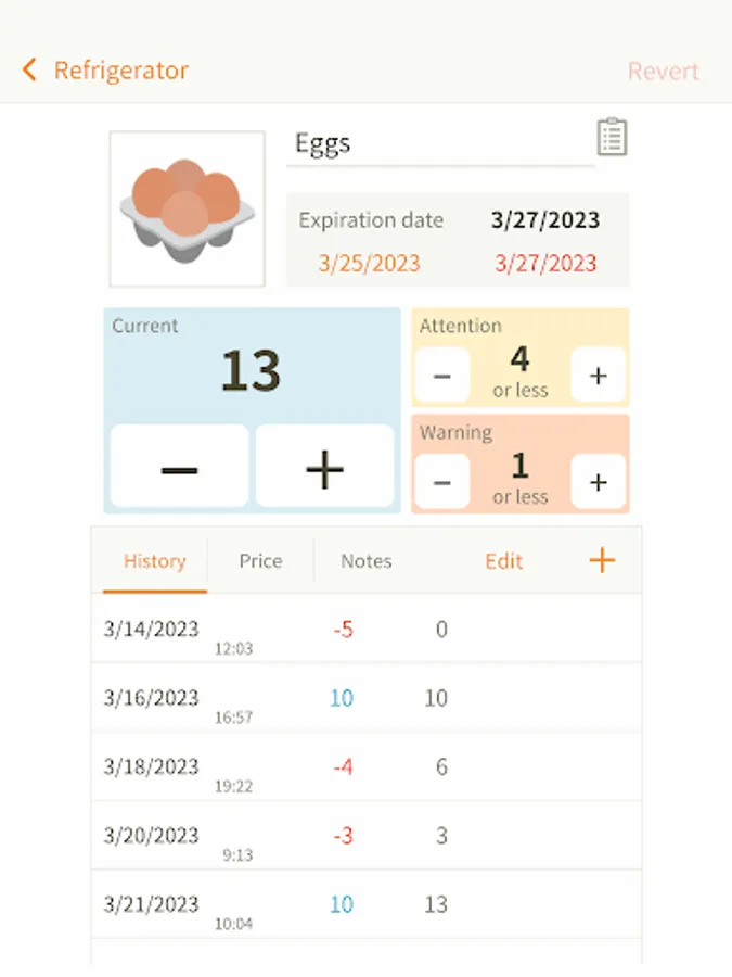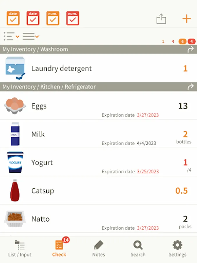 Enter the number of pieces or expiration date of the commodities in your fridge or kitchen storage, for example. Then subtract number when you use them or add when you restock the products.