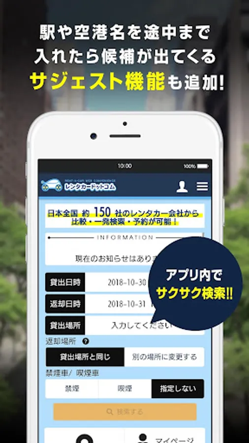 レンタルを希望の駅や空港名を途中まで入れると、候補名を出してくれるサジェスト機能を導入。
