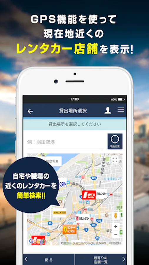 「地図から検索」の機能でGPSを使って最寄のレンタカー店を探すことができます。