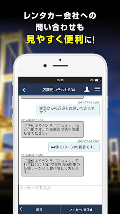 レンタカー店舗にお問い合わせができる機能に、チャット方式の画面を取り入れました。