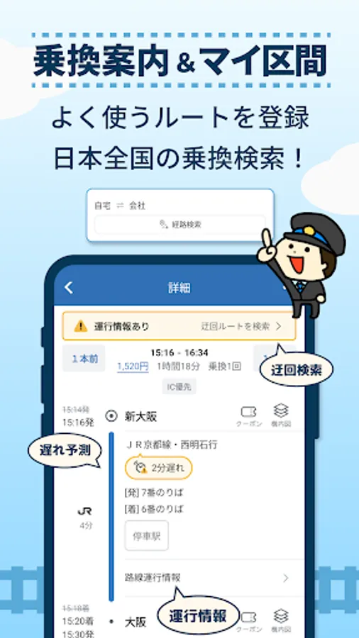 ・You can search for routes that take into account service information such as route delays (corresponds to routes within the JR West area, not compatible with other routes.)