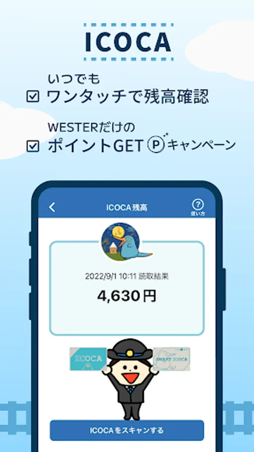 ・You can read your ICOCA balance with "ICOCA Balance". You can also check out the cute Iko-chan.
