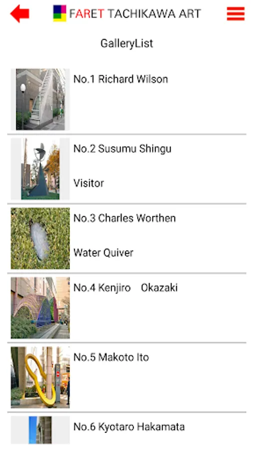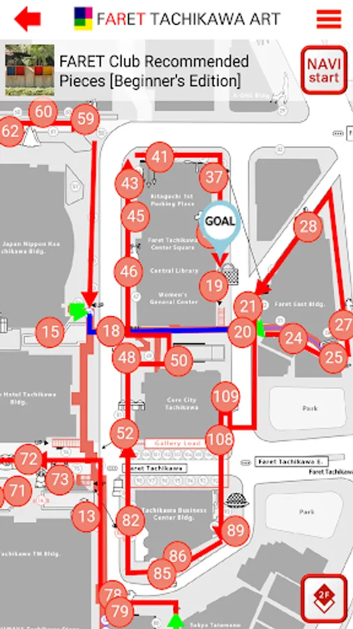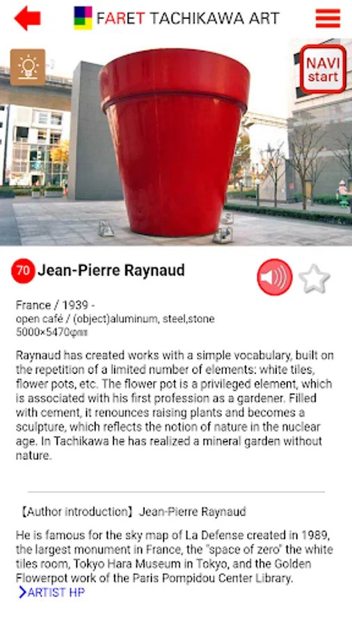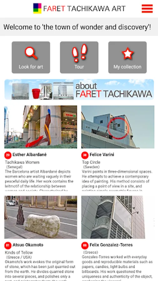 FARET TACHIKAWA ART NAVI is the official, multi-lingual navigation app for the 109 pieces of public art of the FARET TACHIKAWA ART group in Tachikawa City, Tokyo Prefecture.