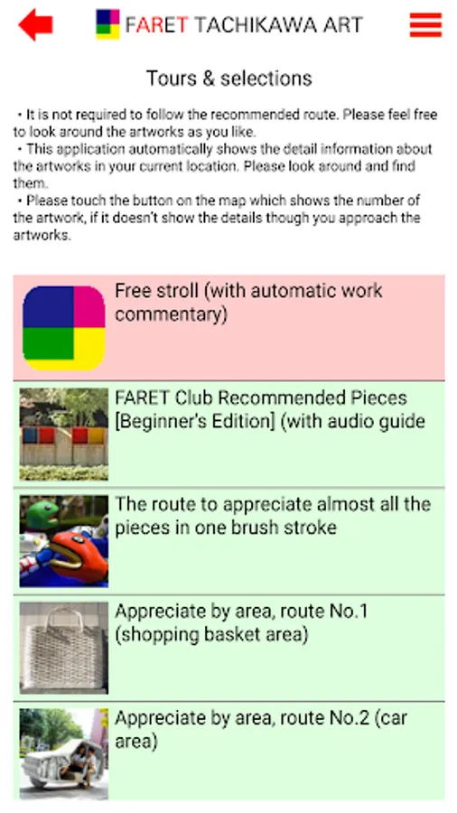This app introduces the various art works of the FARET TACHIKAWA ART group using photos, text, audio, and video. In combination with these, you can be navigated to the locations of the art works using the illustrated map and AR (Augmented Reality) camera function. Once the application has being started, an introduction to the art works will automatically appear when you approach them