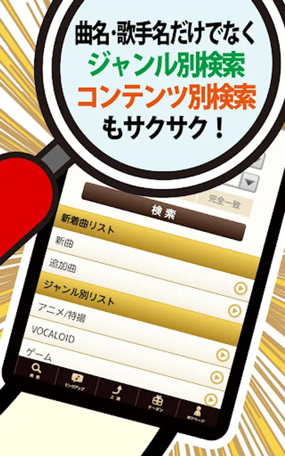 From the button to the right of the header when you want to search extremely trivial, when you want to search by specifying a variety of conditions from the menu of the footer. When there is no confidence in kanji and alphabet notation, if input in hiragana and OK! You can also search in TV and movies etc. tie-up name. Of course, the list of such new song, genre-conditioned!
