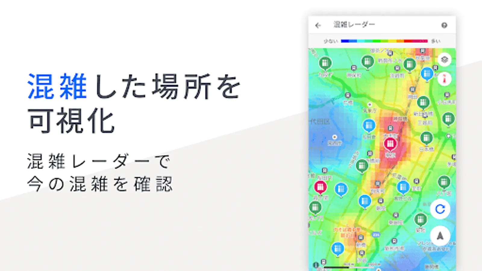 ・Crowd forecast: You can see crowded places with the congestion radar. You can also see how crowded the area around the facility is and the trains are.