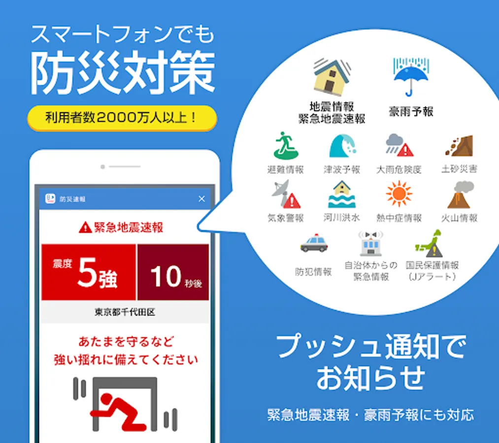 ・ We will promptly notify you of various disaster information such as Earthquake Early Warnings and heavy rain forecasts by push notification.