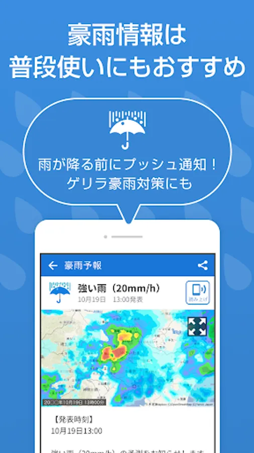 ・ "Heavy rain forecast" is a push notification before heavy rain. It is also recommended for everyday use such as measures against guerrilla rainstorms.