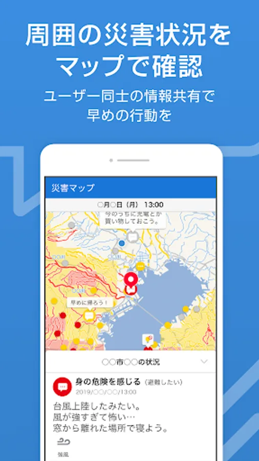 -The "Disaster Map" allows users to share the disaster situation between users and see what kind of disaster is approaching and how far.