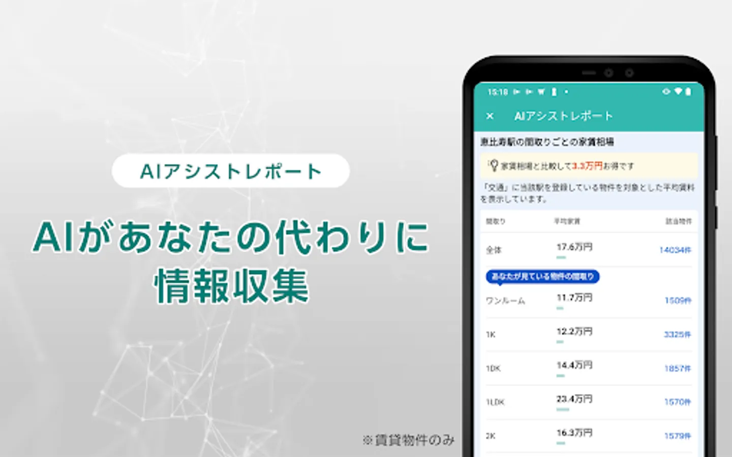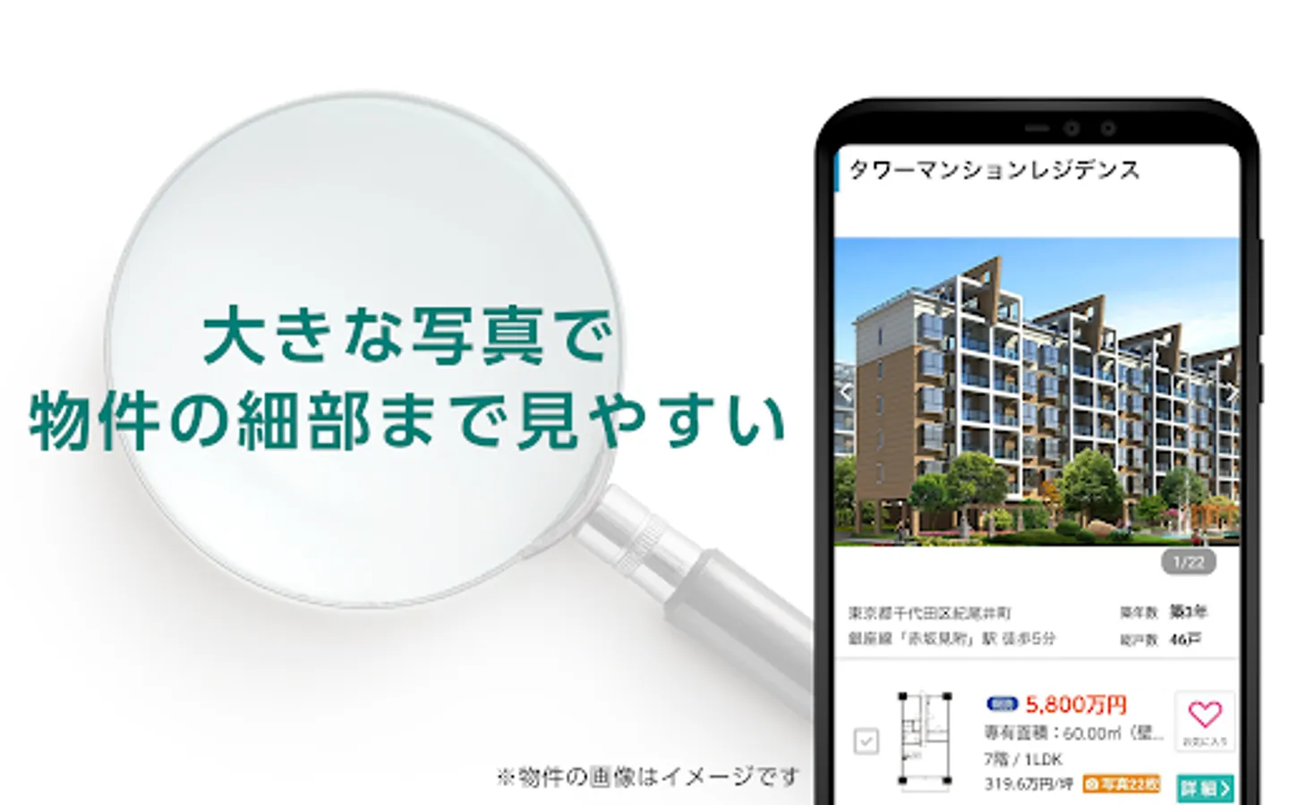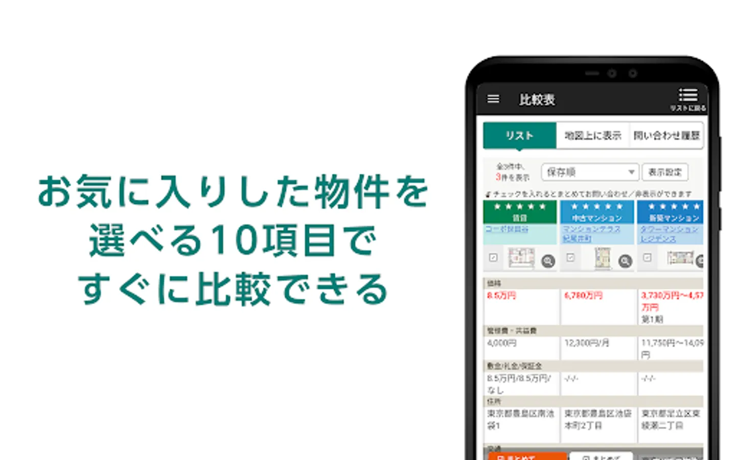 Add your favorite properties to your favorites with one tap. You can display all of the properties on a map, see the location of the property, stations, supermarkets, etc., and check surrounding information. (Excluding used condominiums and used detached houses)