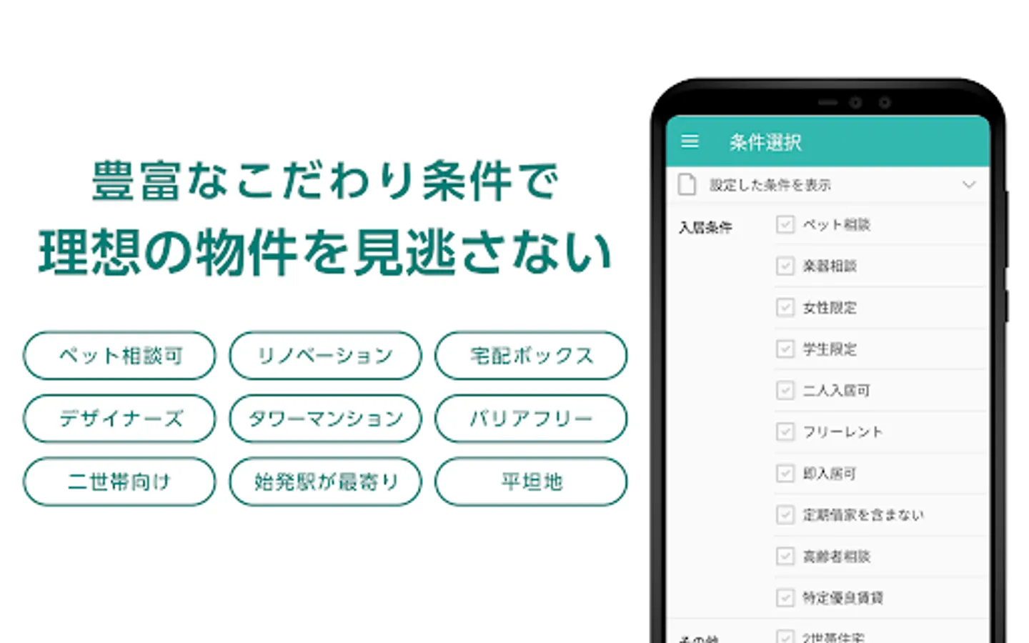 The conditions of the property you are looking for are determined! There are so many special conditions that it's a pain to set them every time. In such a case, tap the "Save conditions" icon in the search results list to save the search conditions, and the next time you search for a property, tap the icon at the top left of the screen and select "Saved conditions" from the slide menu. You can easily search again.