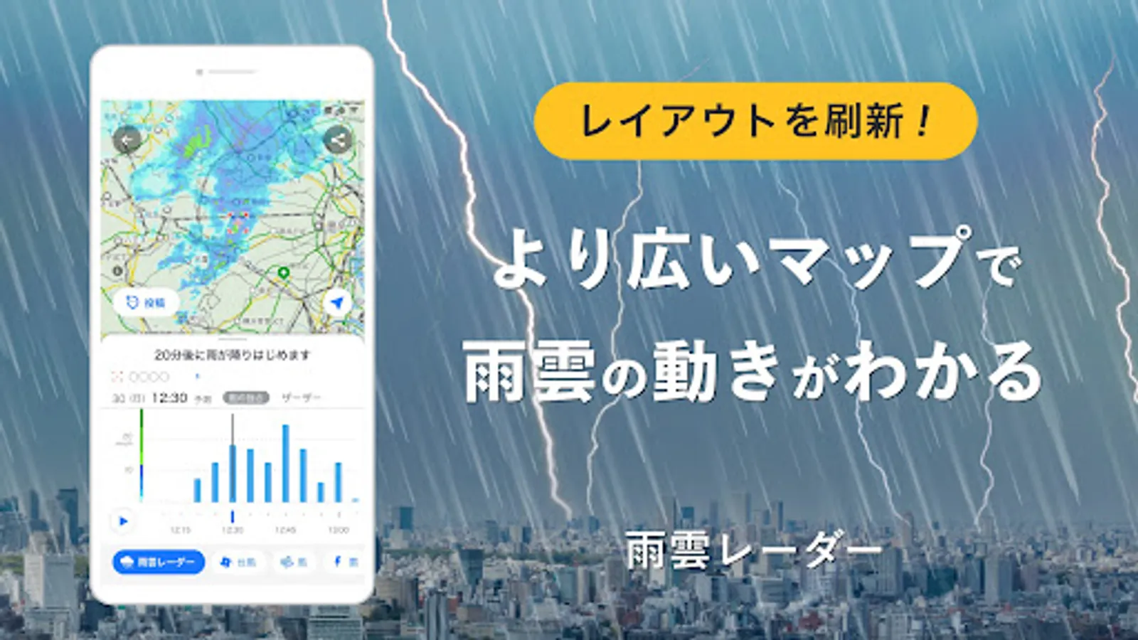 Observations by weather radar and predictions by high-resolution precipitation nowcasts are displayed continuously on a map. You can see the state of rain clouds and the amount of precipitation up to 15 hours ahead.