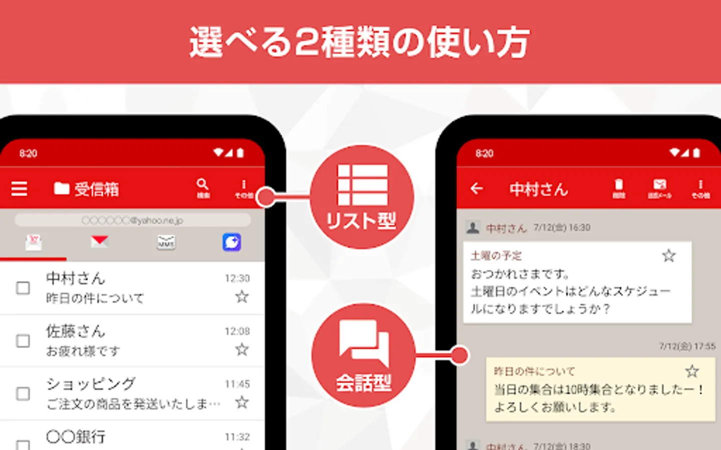 You can manage multiple email accounts at once, including Y!mobile email address (@yahoo.ne.jp), MMS/SMS/+Message (*1), Yahoo! Mail, Gmail, etc. (*2), depending on the purpose. This is the definitive email app that has two display formats that you can choose from.