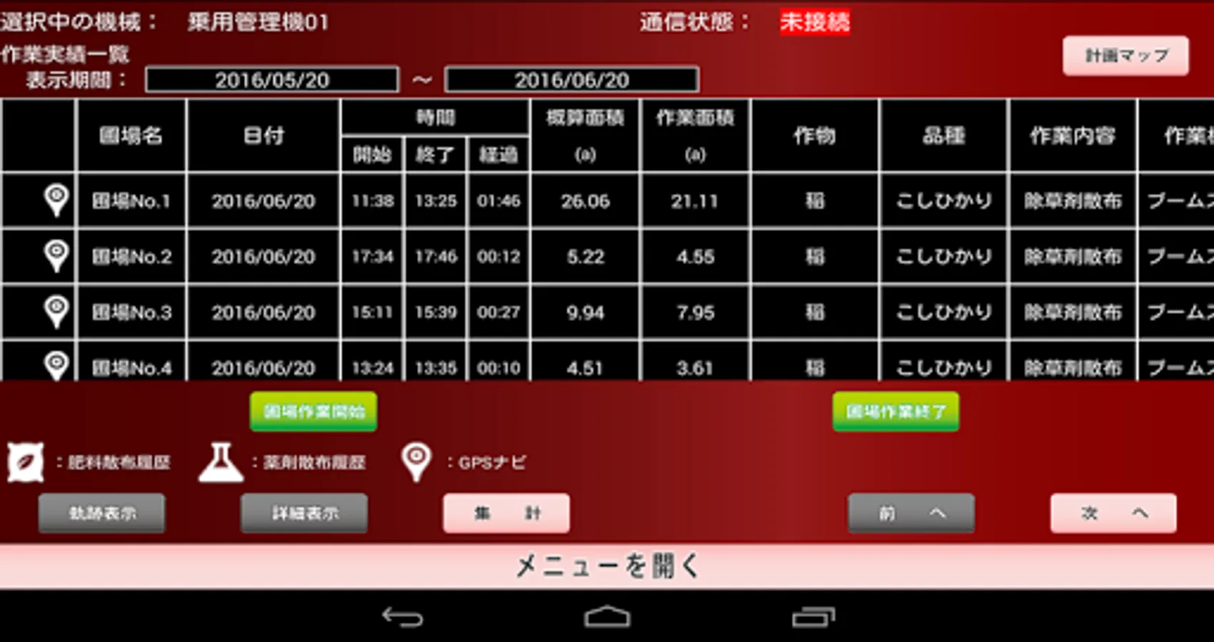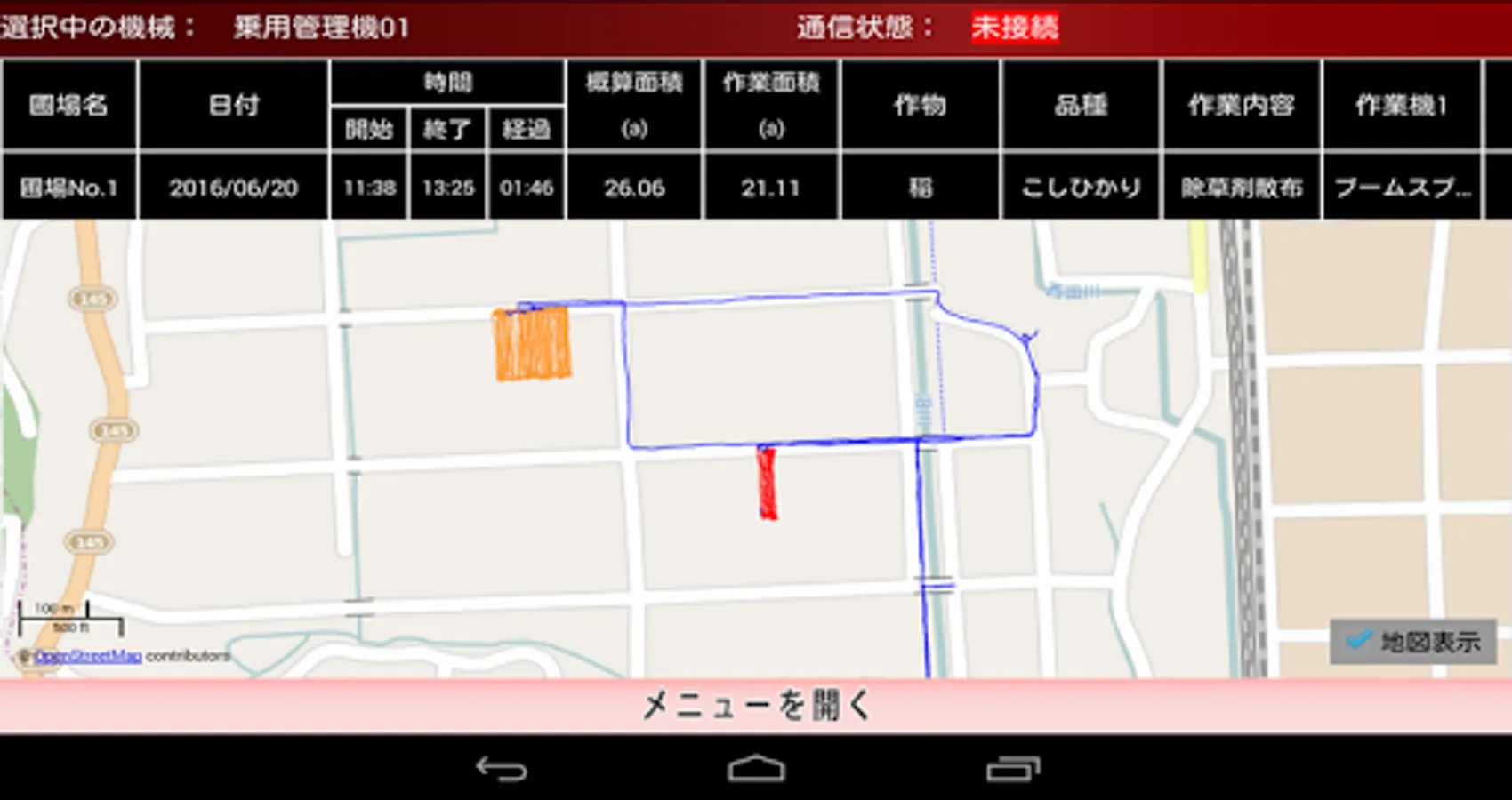 We will automatically acquire and display the list of daily farm work, the trajectory using the Internet map, fuel consumption and work time from the machine.