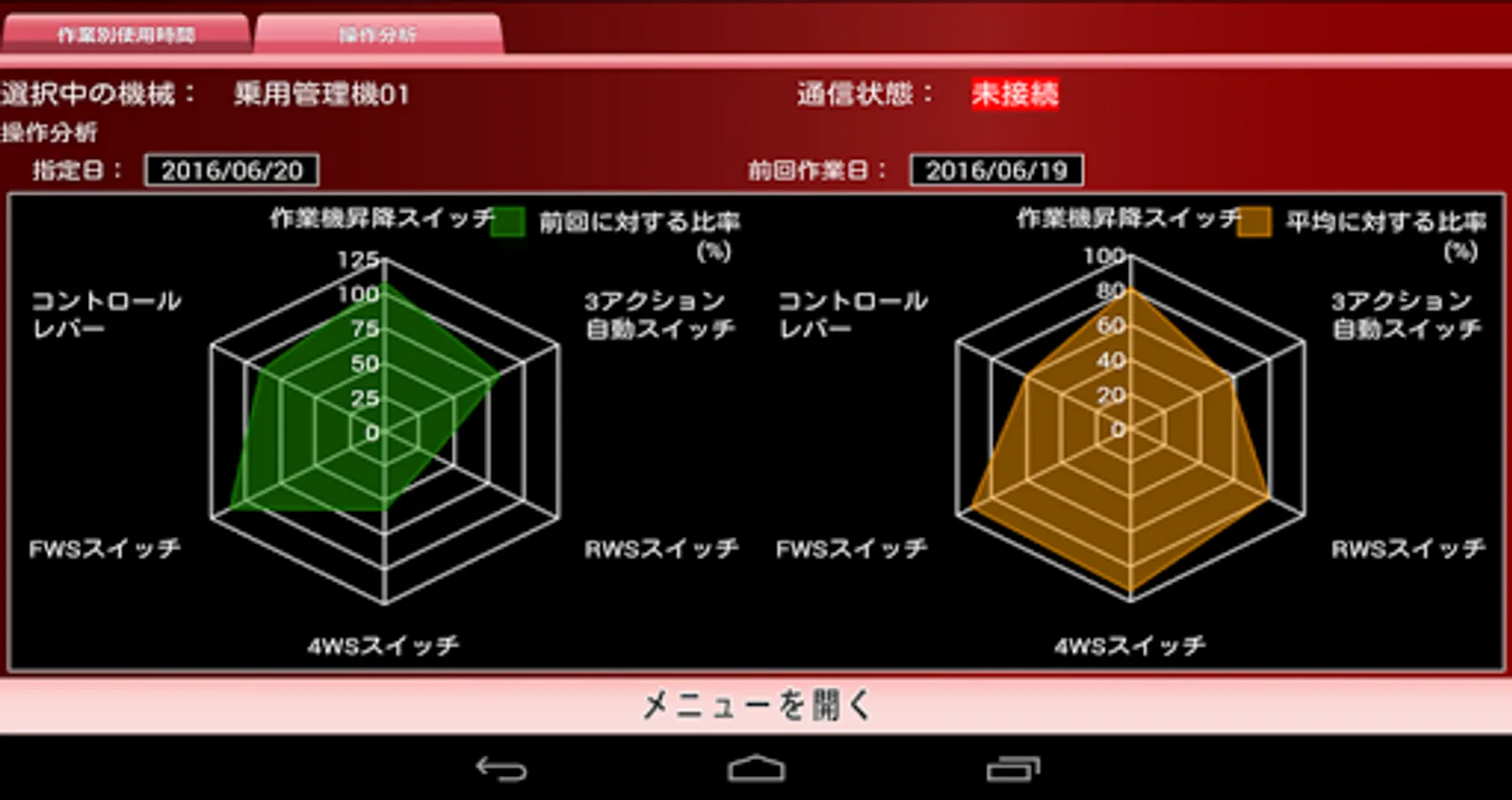 You can analyze the usage time by work (engine stop, work, driving, etc.) and operation analysis, which will lead to improvement of work efficiency.