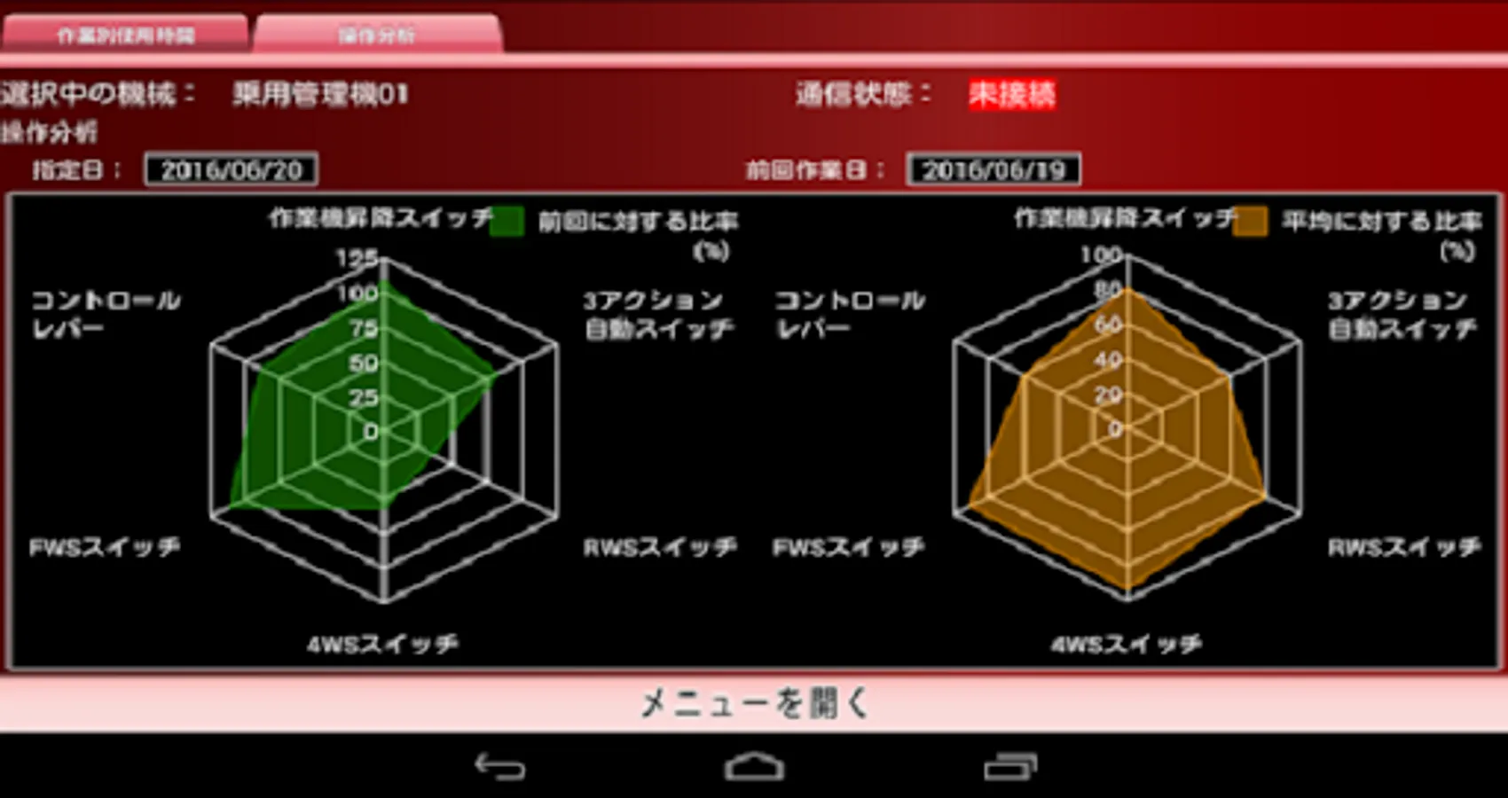 You can analyze the usage time by work (engine stop, work, driving, etc.) and operation analysis, which will lead to improvement of work efficiency.