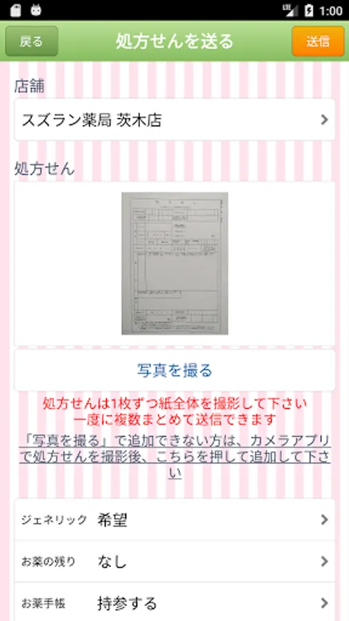 You can take a picture of the prescription received at the hospital or clinic and send it from the app to the Suzuran Pharmacy store. When the medicine is ready, we will contact you by phone or email, so you can receive the medicine without waiting.