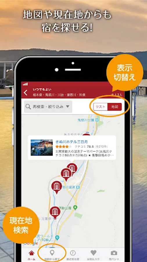 今いる場所の近くの宿を検索できます。