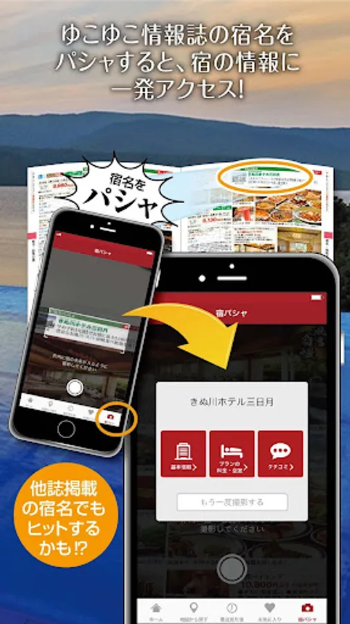 「ゆこゆこ本誌」をお持ちの方は、アプリ搭載のカメラで本誌の宿名を撮影するだけで、すぐに宿情報を確認できる「宿パシャ」機能。撮影するだけなので、必要な情報をスピーディーに検索できます。