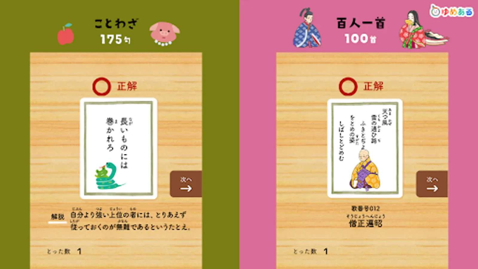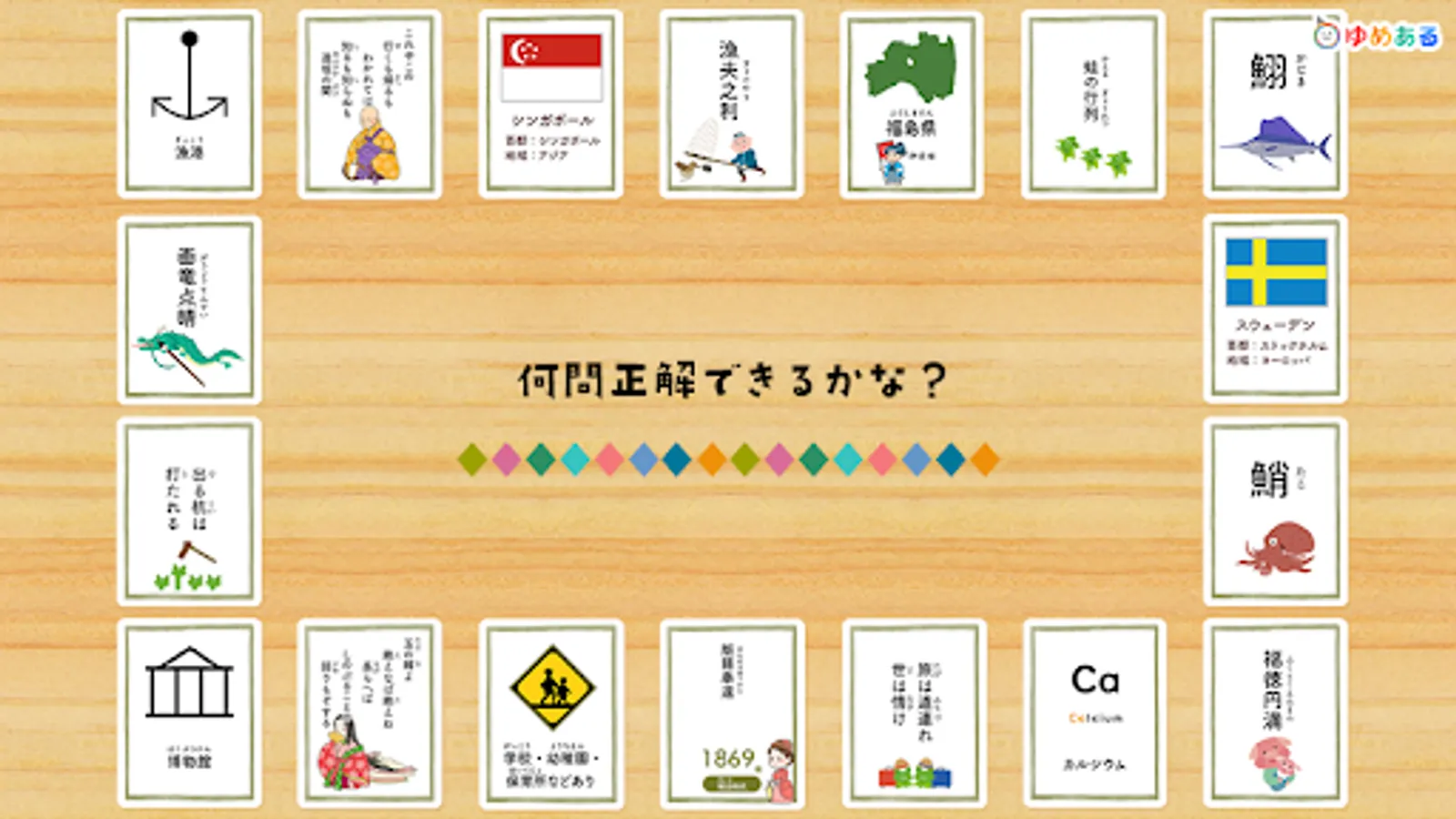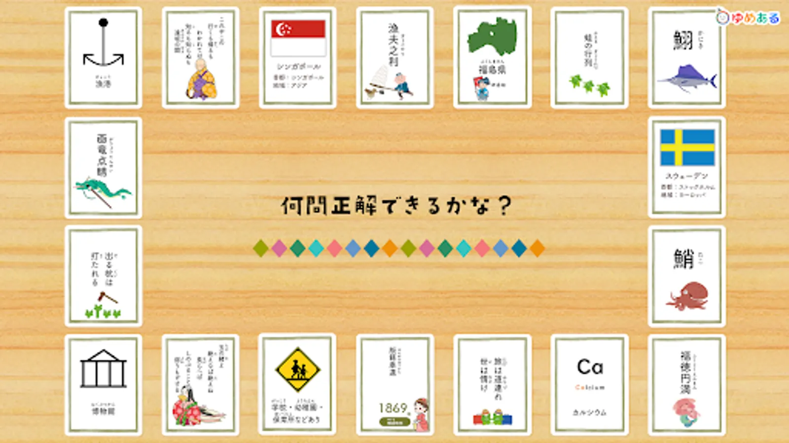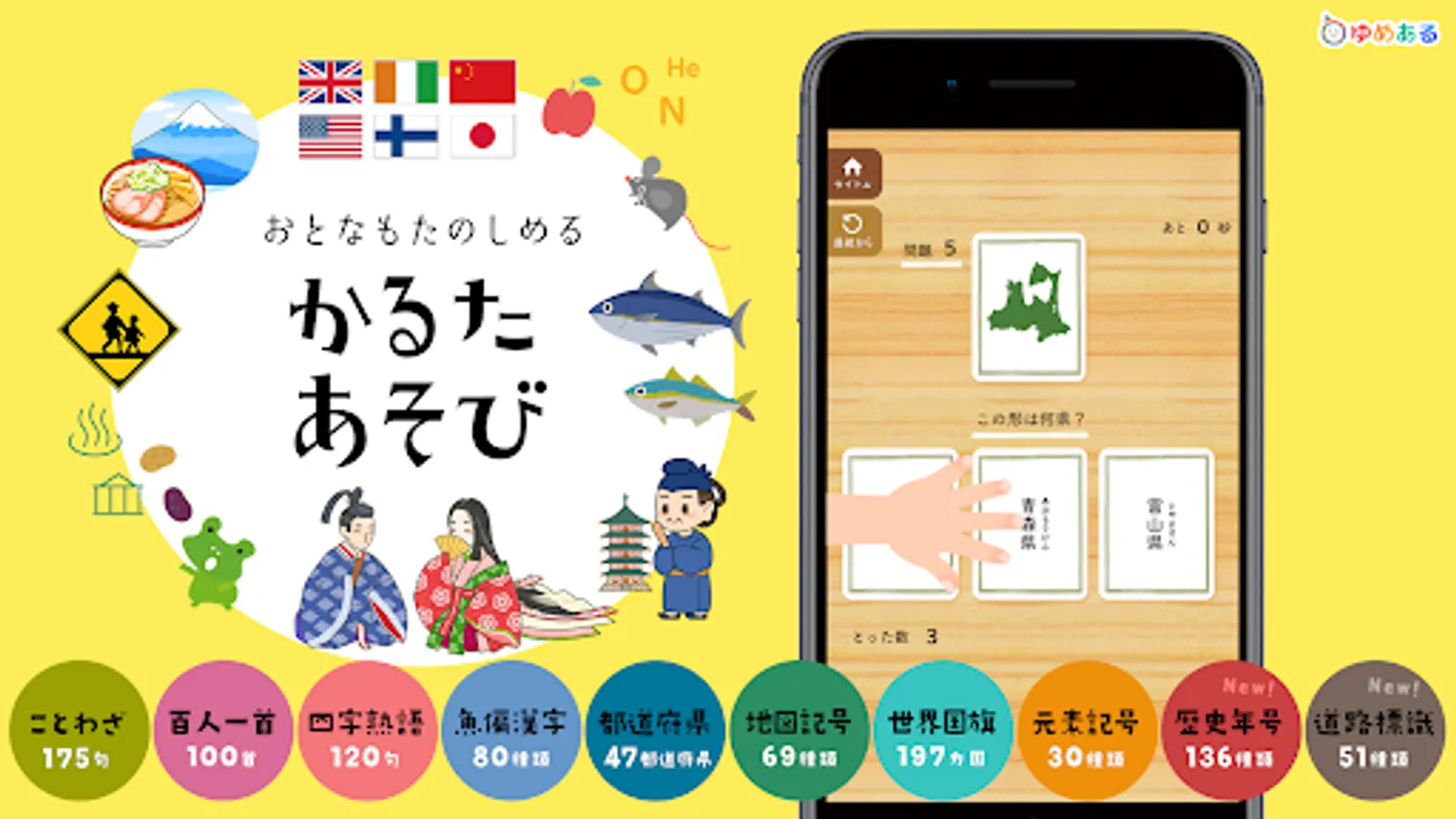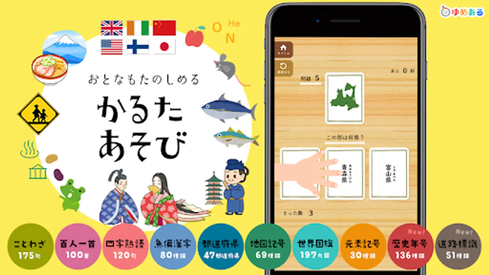 This is a learning app that helps you learn proverbs, Hyakunin Isshu, four-character idioms, fish-oriented kanji, prefectures, map symbols, world flags, historical eras, elemental symbols, and road signs while playing a karuta game.